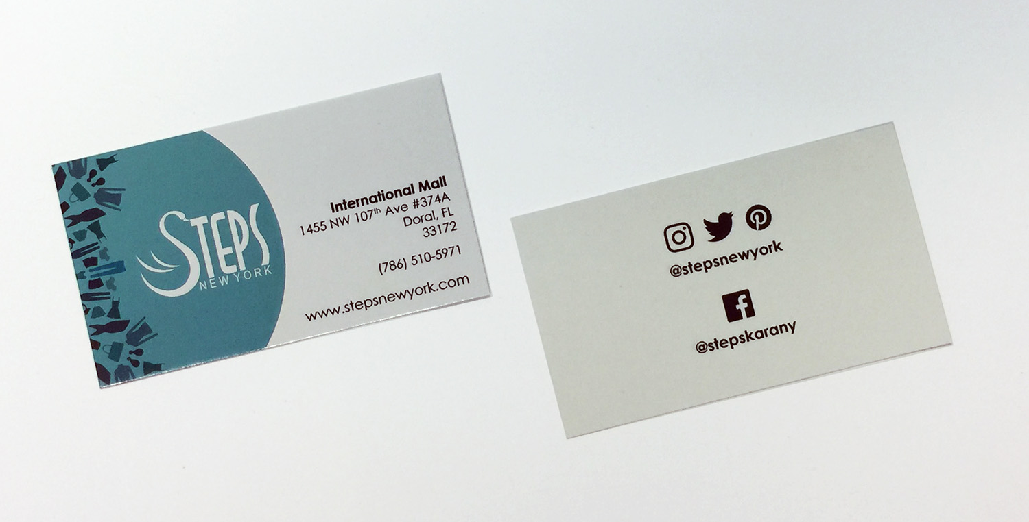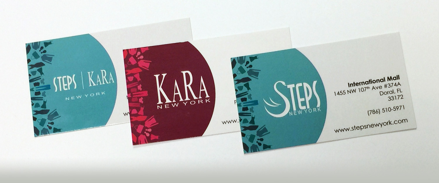 Steps and Kara New York wanted to update their business card design after years of using plain logo cards. They needed business cards for each individual store location as well as for some of the corporate employees. I created two separate versions for Steps and Kara to use in the stores, as well as a third version with a combined logo for the corporate employees.