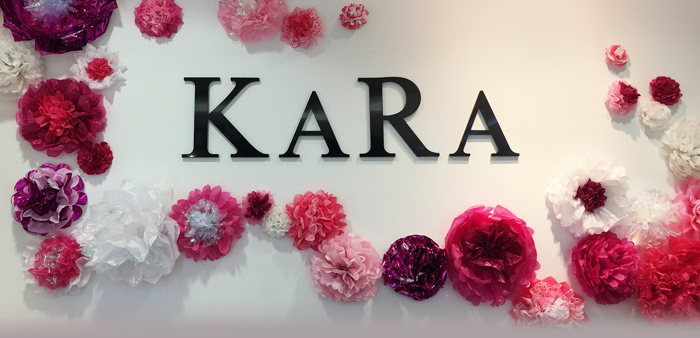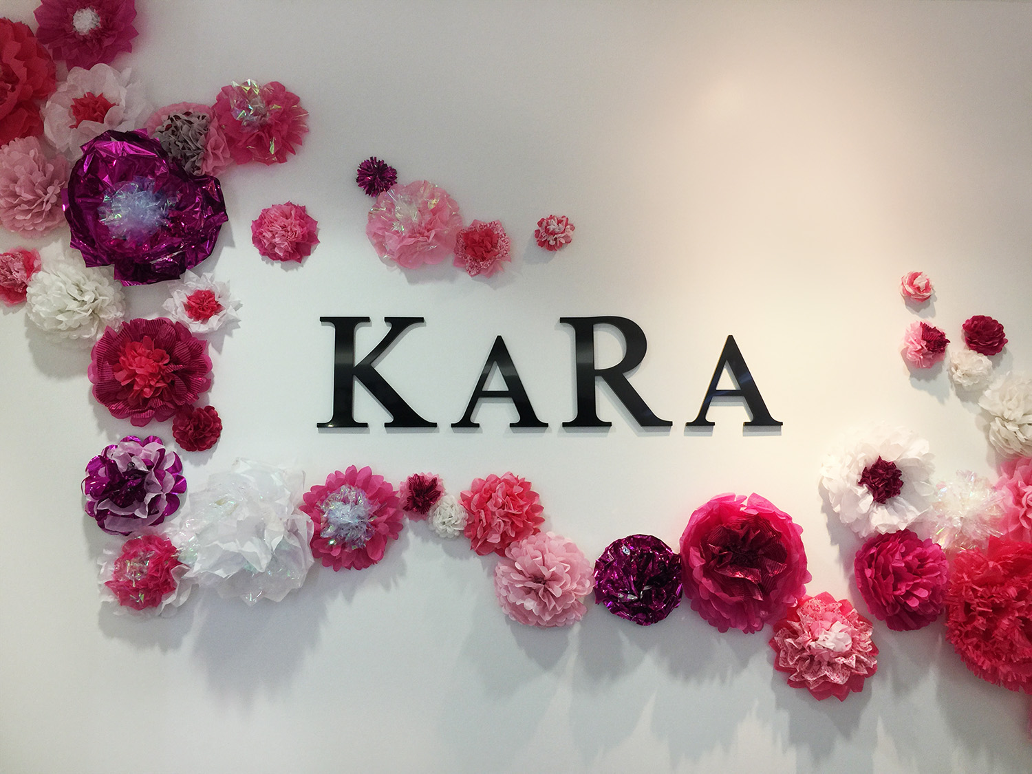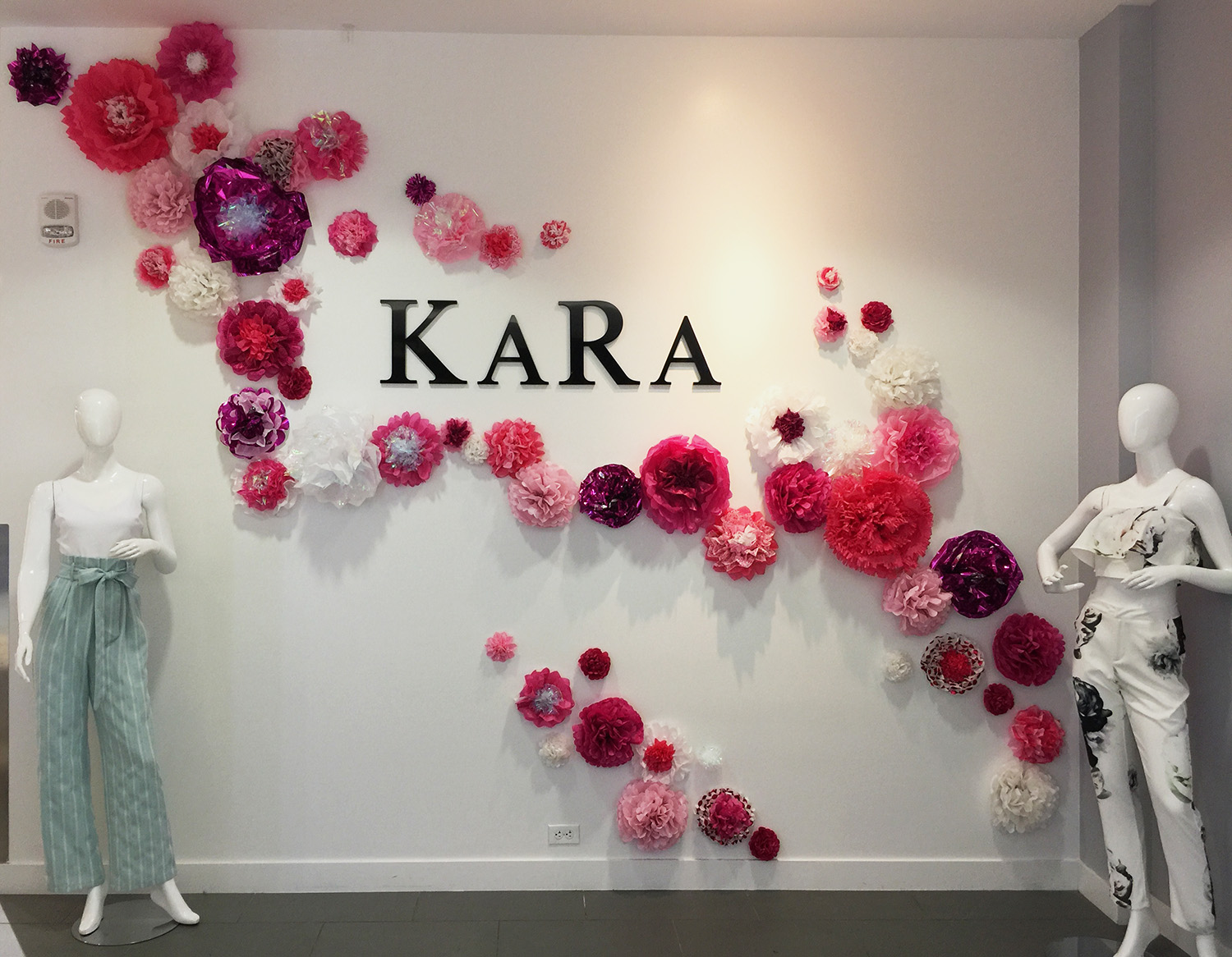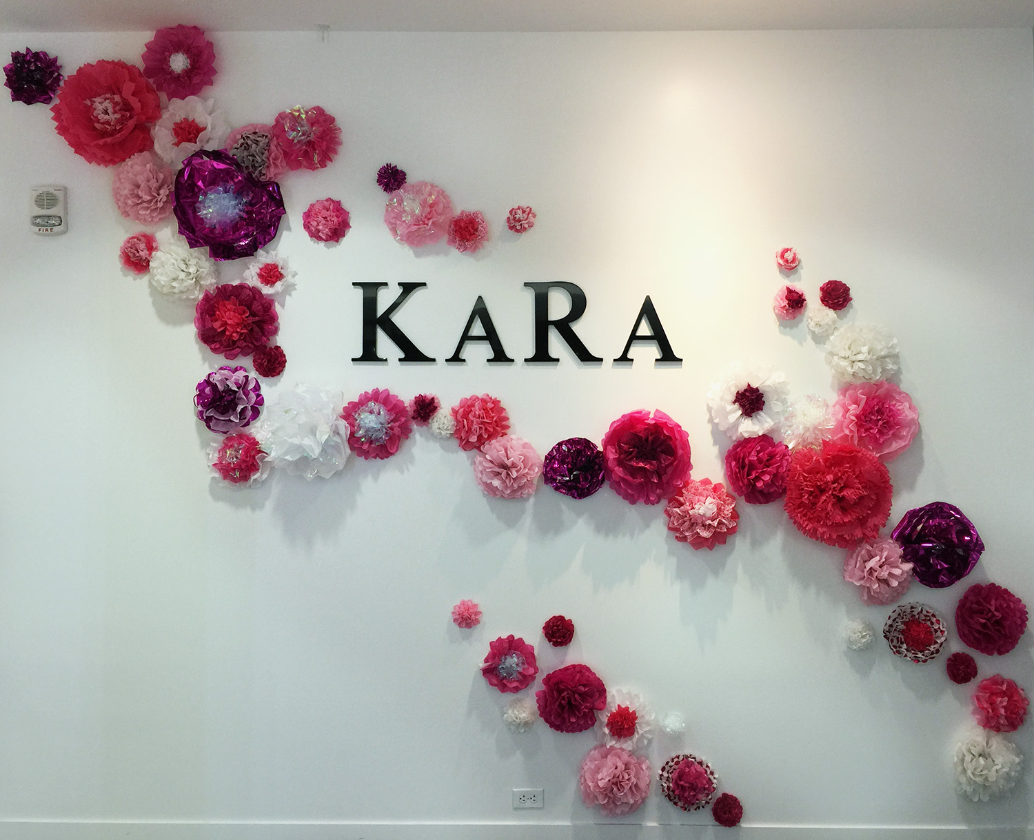 I chose to create an installation using tissue paper flowers that would surround a Kara logo. I had only a couple days to complete the project before the store opened, so I used a mixture of hand-made and pre-made flowers to expedite the process. The handmade flowers added variety and elevated the project beyond the "party store" look of the pre-made flowers. I was able to assemble and install the flowers over a period of two days.