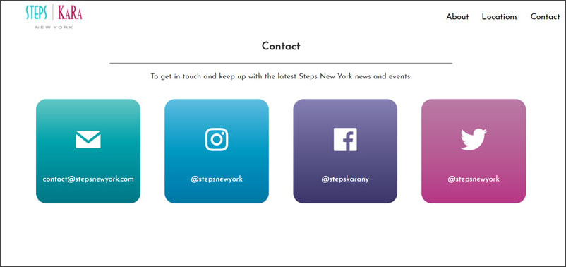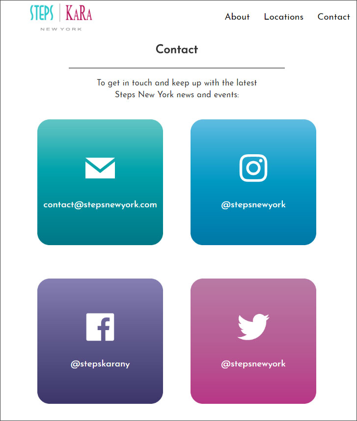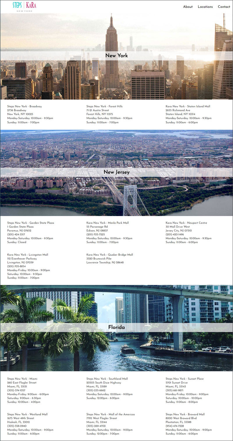 One of my main projects at Steps and Kara New York was redesigning their company website. Their web presence had not been updated in many years, so I chose to start over from scratch. They had relatively simple requirments for the site-it had to provide basic information about the company, include a list of locations, and feature current deals and news items on the home page. I built the site using the mobile-first Bootstrap framework, which provided basic components which could be easily customized and would display well on all platforms.