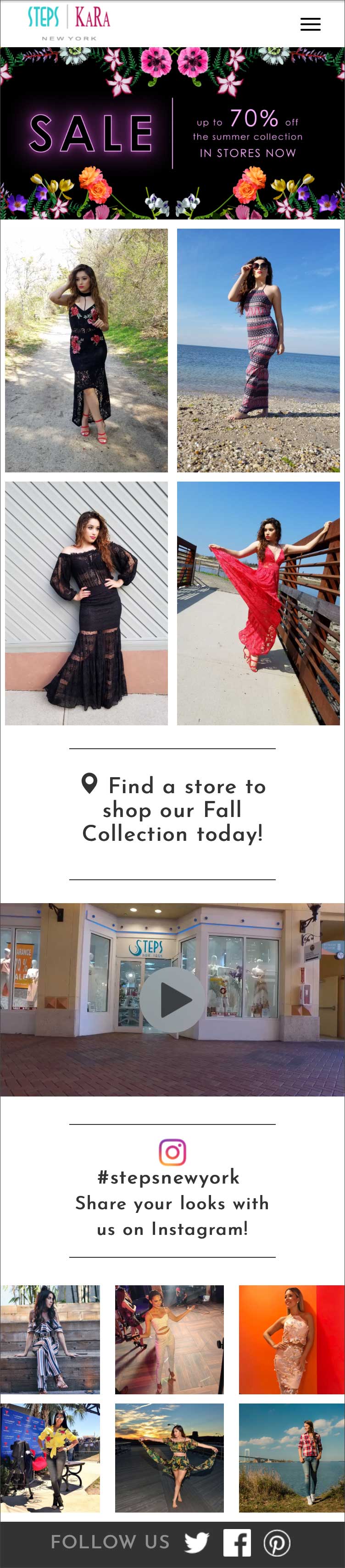 The website home page featured a carousel showing the most recent news, events, and sales that visitors would see immediately upon opening the page. The home page also included seasonal photographs showing current merchandise, a promotional video that could be changed out with the seasons, a selection of images from the company's Instagram page, and links to their other social media. The layout adapted according to screen size, displaying elements differently on desktop (above) and mobile (below).