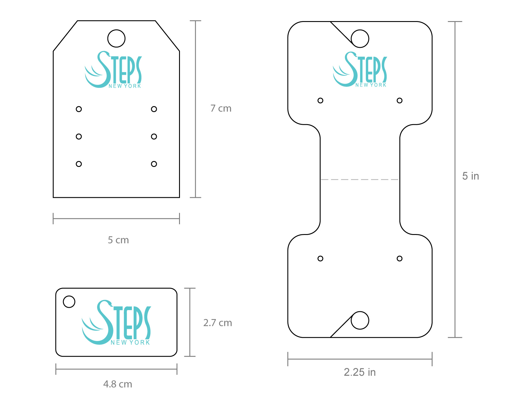 I designed sew-in tags and jewelry cards for Steps New York. The specifications were sent to vendors to be used for Steps' orders.